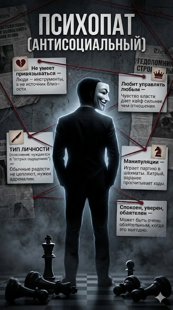 Помните того харизматичного коллегу, который очаровывал всех с первого слова? Или бывшего, который казался идеальным, пока вы не начали замечать странные вещи? Я тоже думал, что психопаты — это только маньяки из криминальных хроник. Пока не столкнулся с одним в обычной жизни. Оказалось, они ходят среди нас в дорогих костюмах и с обезоруживающими улыбками. Сегодня разберём портрет антисоциального типа личности, чтобы вы могли увидеть красные флаги до того, как попадёте в ловушку.