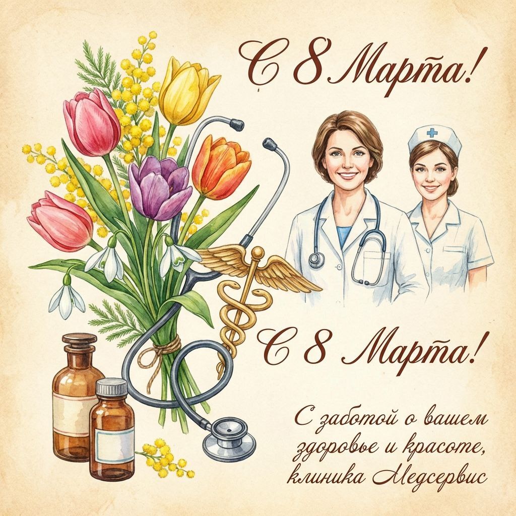 ! От всего сердца поздравляем вас с Международным женским днём — 8 Марта! Желаем вам крепкого здоровья, бодрости духа, благополучия и неиссякаемого запаса энергии. Пусть каждый день приносит радость, приятные сюрпризы и тёплые моменты в кругу близких. 💕 Мы ценим ваше доверие и всегда готовы позаботиться о вашем здоровье — потому что ваше благополучие для нас на первом месте. Будьте счастливы, любимы и здоровы! 💕С любовью и заботой ООО Медсервис 💕