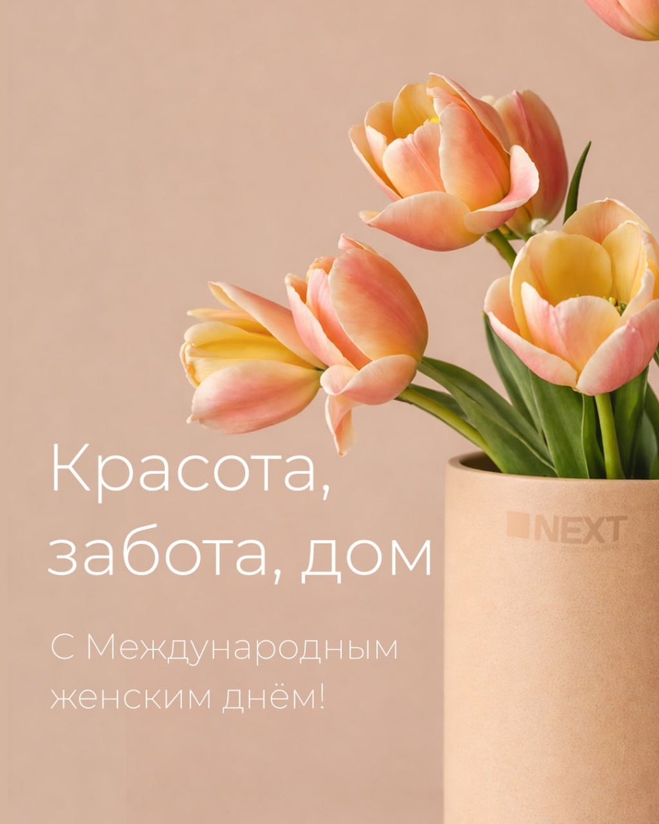 Именно благодаря вам квартира становится местом, куда хочется возвращаться. 🌷 Команда NEXT Девелопмент поздравляет вас с 8 Марта 🌷 Пусть в вашей жизни будет больше света в окнах, тепла в доме и уютных мест для счастья. Все, что делает женщина — незаметно. Заметно становится, когда она это не делает.