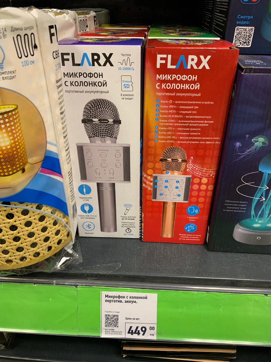 В продаже появились микрофоны с портативной колонкой. Он аккумуляторный. Кнопочное управление. Время работы на полном заряде 2 часа. На выбор есть с золотистом и серебряном цвете.