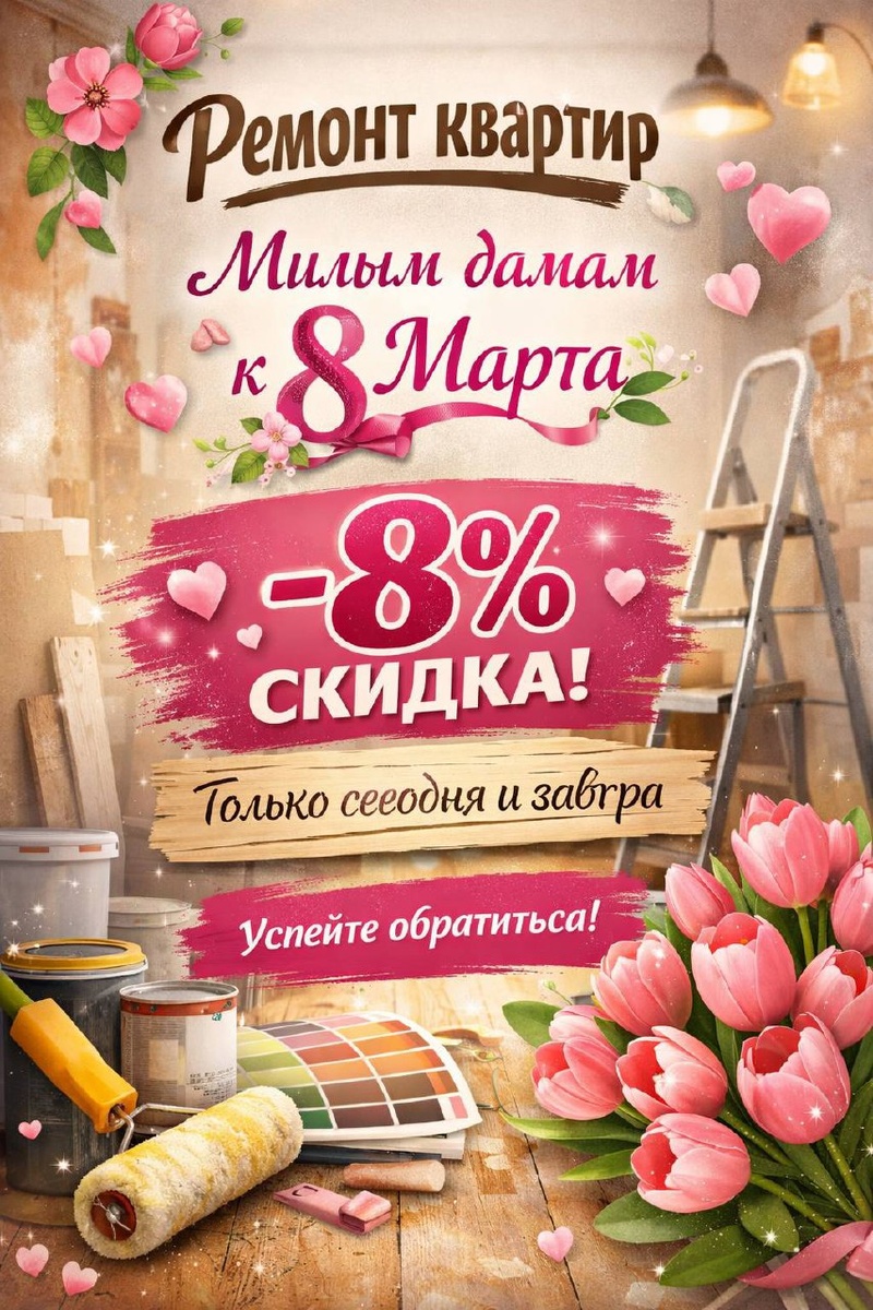 ! Милые дамы, поздравляем вас с праздником весны, красоты и вдохновения! Пусть дома всегда будет уют, тепло и атмосфера, в которую хочется возвращаться. А чтобы уюта стало ещё больше, мы приготовили небольшой подарок 🎁 🎉 Скидка −8% на ремонт квартир для прекрасной половины человечества. ✔ ремонт квартир и домов ✔ фиксируем цену и сроки в договоре ✔ берём на себя материалы и организацию ✔ результат без нервов и бесконечных поисков мастеров ⏳ Акция действует только сегодня и завтра. Если вы как раз думали о ремонте возможно это тот самый знак 😉 Напишите нам или оставьте заявку и зафиксируйте −8% на ваш будущий ремонт. С праздником, красоты, уюта и хорошего настроения! 🌷☕