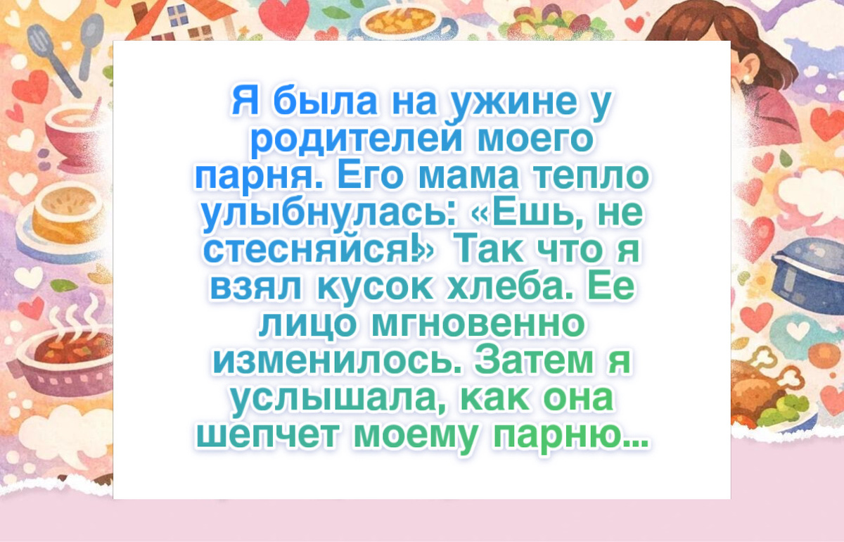 “Я ужинала у родителей моего парня. Его мама тепло улыбнулась: ‘Ешь, Катя, не стесняйся!’ Я взяла кусочек хлеба, и её лицо мгновенно изменилось. Я подумала, что мне это показалось. Вышла на кухню и услышала, как она шепчет моему парню: ‘С этими р-у-к-а-м-и? Алекс, как такое возможно?! Она же девушка! Надо было просить ножницы!’ Я, конечно, не знала правил, как правильно резать хлеб. Вернувшись в комнату, старалась не смотреть на хлеб.”