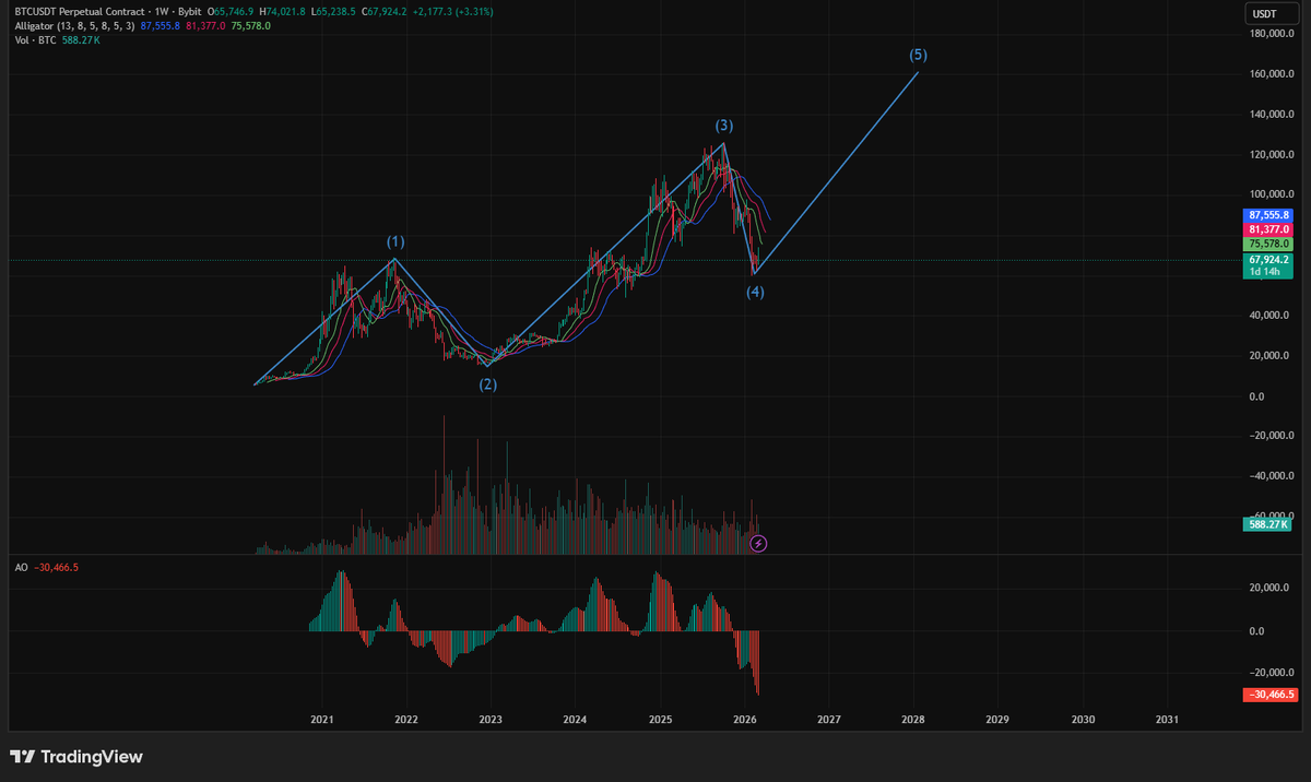 Биткоин снова приковывает внимание. После мощного роста с 2023 года до исторических максимумов выше $74 000 сейчас мы видим коррекцию. Но что говорят волны Эллиотта? Я проанализировал недельный график BTCUSDT и нашёл на нём классическую пятиволновую структуру, которая может определить движение цены на месяцы вперёд. Теория волн Эллиотта — это метод технического анализа, основанный на идее, что цена движется циклами из пяти волн в направлении тренда (импульс) и трёх волн против тренда (коррекция). Психология толпы создаёт повторяющиеся паттерны, и биткоин с его эмоциональными трейдерами — идеальный полигон для этого анализа. На графике отлично видно, как цена формирует именно такую структуру. Давай разберём её по порядку. С ноября 2022 года биткоин начал восстановление после медвежьего дна около $15 500. Это был классический старт новой импульсной волны. Первая волна часто бывает самой слабой, но она закладывает фундамент. В первой половине 2023 года цена скорректировалась примерно на 3