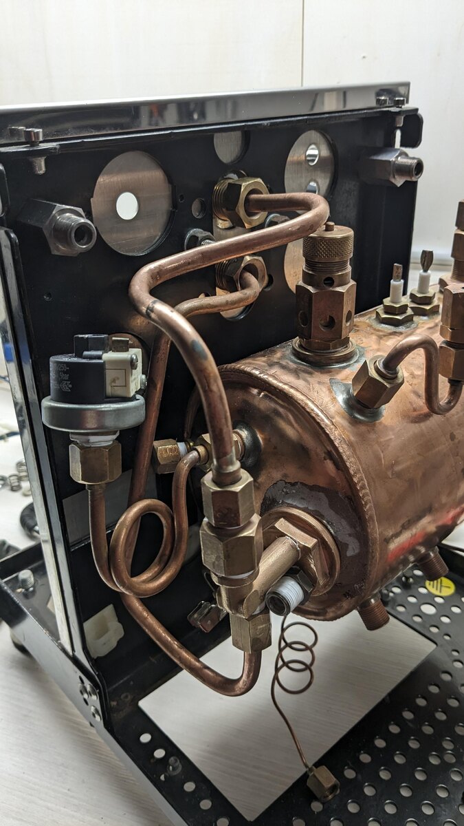 Иногда в ремонт попадает техника, которая требует не обычного обслуживания, а настоящего восстановления. Недавно ко мне попала редкая модель профессиональной кофемашины эспрессо. Машина много лет активно использовалась и в какой-то момент практически перестала работать. Владелец заметил несколько серьёзных проблем. Кофе стал готовиться хуже, давление в системе стало нестабильным, а внутри корпуса появилась протечка воды. Также аппарат начал значительно дольше нагреваться. Такие симптомы чаще всего говорят о том, что кофемашине требуется комплексное обслуживание и глубокая чистка. После первичной диагностики было принято решение провести полную реставрацию кофемашины. Первым этапом ремонта стала полная разборка оборудования. Были сняты все основные узлы: бойлер, система подачи воды, клапаны давления и трубки гидравлической системы. Разборка показала основную проблему. Внутри бойлера образовалось большое количество минеральных отложений. Со временем накипь появляется из-за жёсткой воды и