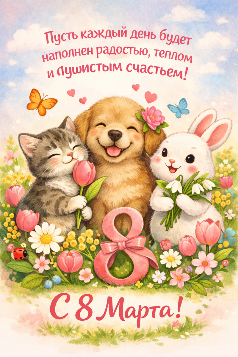 С 8 Марта! 🌷 Пусть в жизни будет семейное тепло, материальные блага и приятные неожиданности. Пусть рядом всегда будут те, кто радуется вам так же искренне, как хвостатые друзья. 🐶🐱
