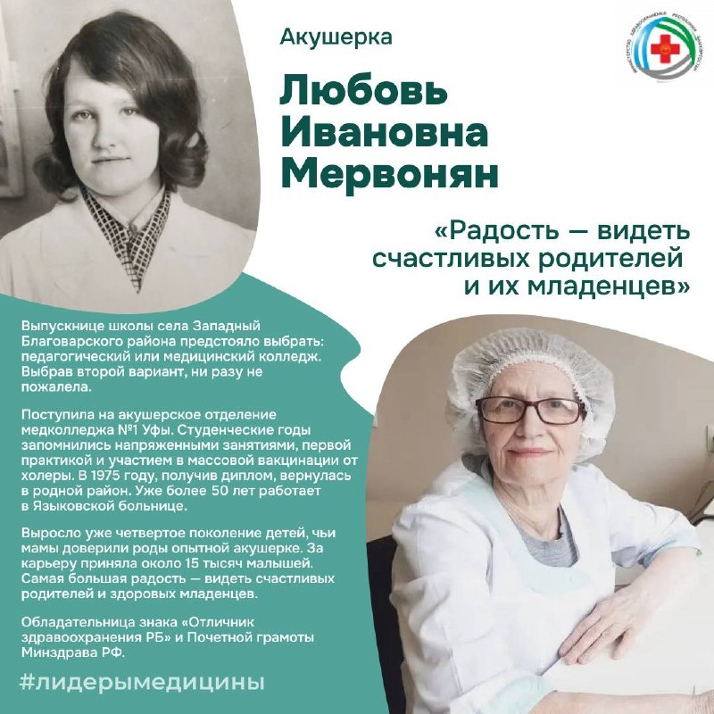 📌Сегодня в рубрике #лидерымедицины акушерка Языковской центральной районной больницы Любовь Ивановна Мервонян. Когда-то давно выпускнице школы села Западный Благоварского района предстояло сделать выбор: пойти учиться в педагогический или медицинский колледж. Выбрав второй вариант, она ни разу не пожалела об этом. 📚Любовь Ивановна поступила на акушерское отделение медицинского колледжа № 1 г. Уфы. Студенческие годы остались в памяти такими же, как у многих: напряжённые занятия, серьёзные лекции и первая практика в больнице. Особенно ей запомнилось участие в массовой вакцинации жителей Уфы от холеры. В 1975 году, получив диплом, Любовь Ивановна вернулась в свой родной район. Вот уже более 50 лет она работает в Языковской больнице. 🍼Сегодня выросло уже четвертое поколение детей, чьи мамы доверили свои роды опытной акушерке из Языковской больницы. За свою долгую карьеру Любовь Ивановна приняла около 15 тысяч малышей! — Самая большая радость для меня — видеть счастливых родителей