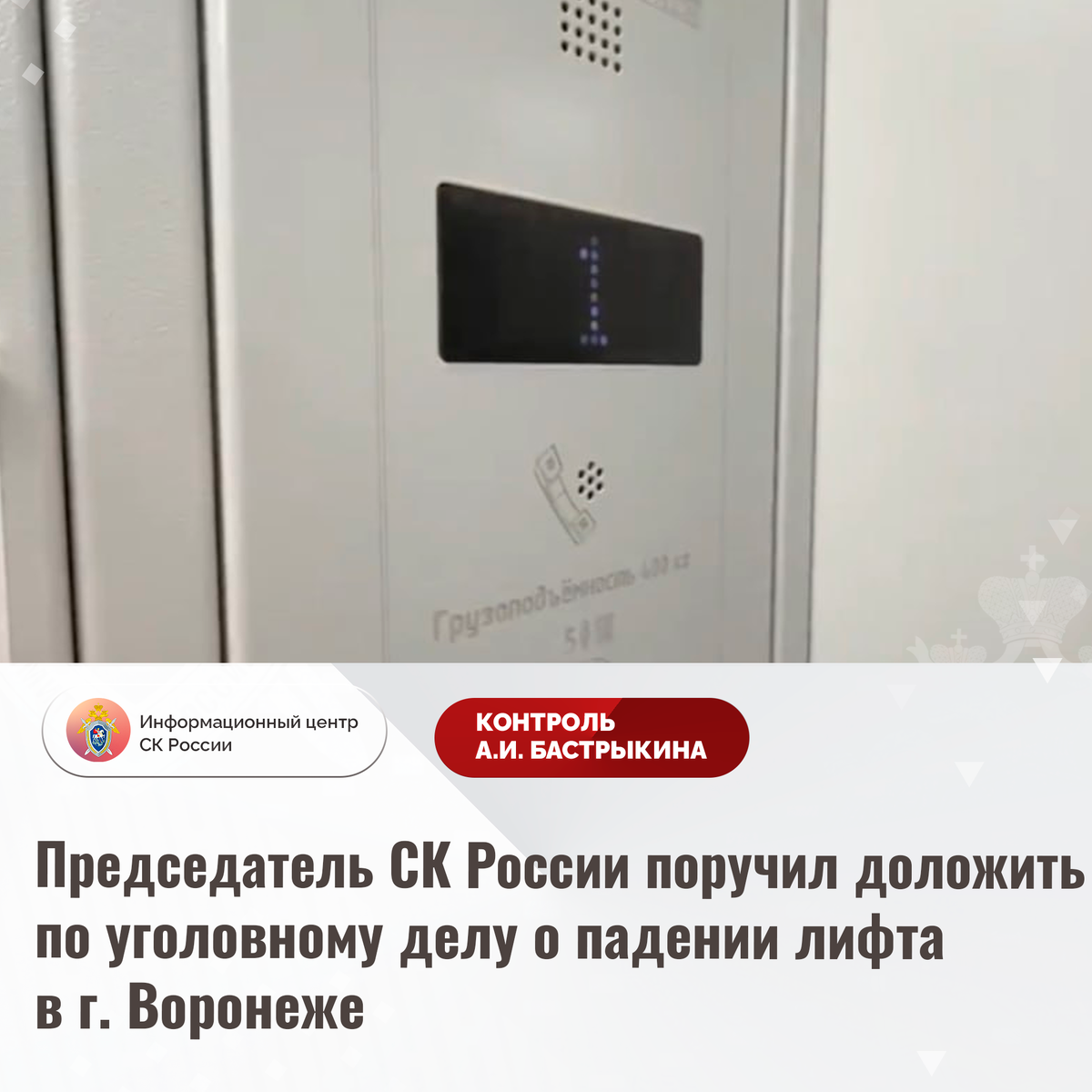 Председатель СК России поручил доложить по уголовному делу о падении лифта в г. Воронеже В сети Интернет сообщается, что в марте текущего года в многоквартирном доме на бульваре Победы города Воронежа с высоты четвертого этажа произошло обрушение лифтовой кабины с находящимися внутри людьми. Отмечается, что самостоятельно выбраться местные жители не смогли и вынуждены были более полутора часов ожидать сотрудников специализированной службы, так как диспетчер не отвечал на вызовы. В СУ СК России по Воронежской области возбуждено уголовное дело. Председатель Следственного комитета Российской Федерации Александр Иванович Бастрыкин поручил руководителю СУ СК России по Воронежской области Михаилу Алексеевичу Селюкову доложить о предварительных и окончательных результатах расследования уголовного дела. Исполнение поручения поставлено на контроль в центральном аппарате ведомства. #СледственныйКомитет #СКРоссии #СКР #ИЦСКР #ИнформационныйЦентр #АлександрБастрыкин #ПредседательСКР #КонтрольПред