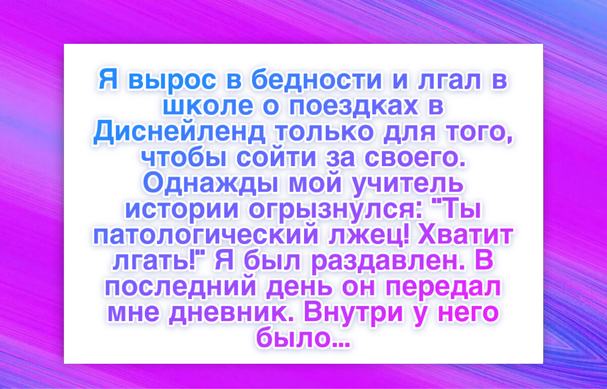 “В третьем классе я часто терял свой обед по дороге в школу. На самом деле мои родители просто не могли позволить себе его приготовить. Я сидел в дальнем углу библиотеки, чтобы никто не видел, что я ничего не ем. Однажды моя учительница Марина начала просить меня помогать ей во время перемены наводить порядок в учительской. Каждый день на столе там оказывался лишний бутерброд и яблоко. Она говорила, что родительский комитет снова прислал слишком много еды и будет жалко, если она пропадет. Только когда я стал взрослым, я понял, что никакой еды от родительского комитета не было. Она целый год покупала мне обеды на свою зарплату.”