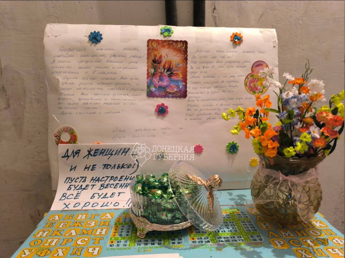 Поздравление с 8 марта в одном из подъездов в Пролетарском районе Донецка
