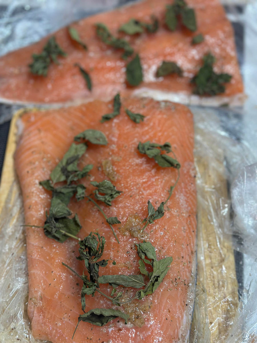 Утром снимаем плёнку. Промываем рыбу. Не сильно. Просто убрать все специи и листву мяты, чтобы не попадалась при поедание вкуснейших бутербродов.