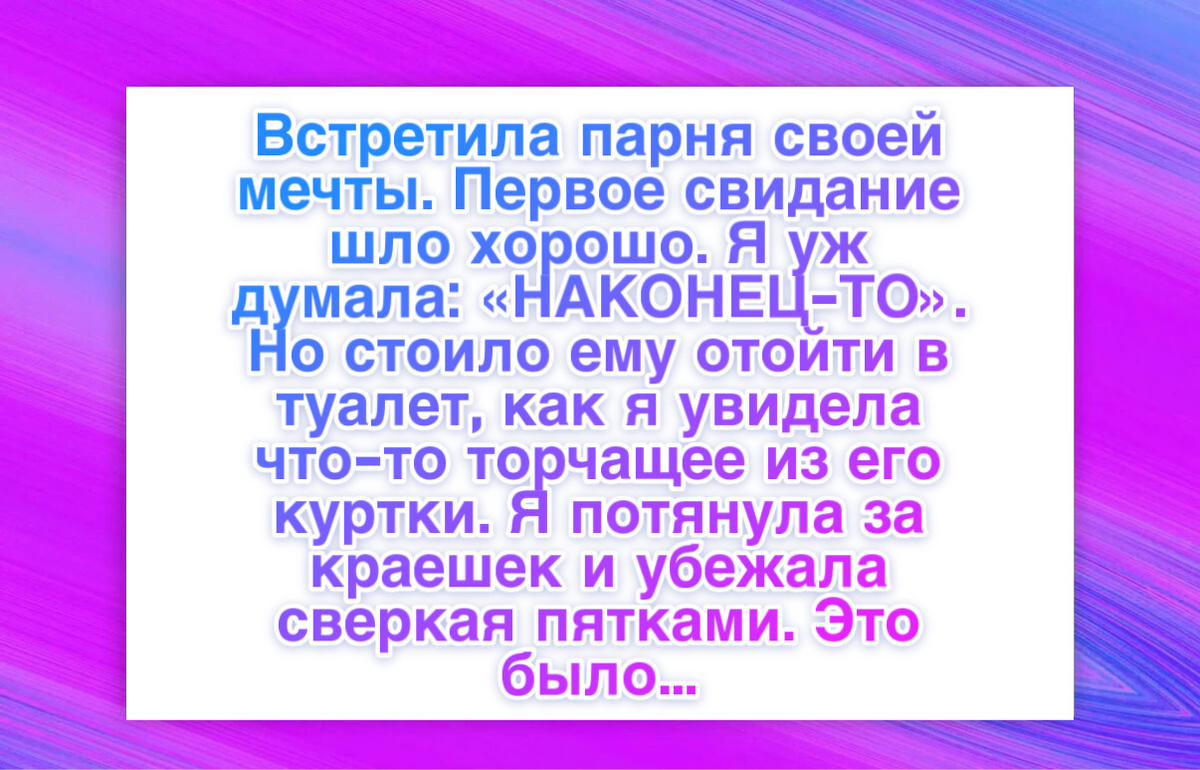 “Она пришла на свидание со своим маленьким ребенком. Ничего страшного, у меня тоже есть дети, я все понимаю. Она сказала, что хочет купить ребенку наряд для семейной фотосессии на рождественской открытке. Немного неловко, но почему бы не пройтись по магазинам. Потом она начала прикладывать одежду ко мне, объясняя, что я примерно такого же размера, как ее бывший. Оказалось, он тоже будет на той фотосессии, хотя они уже не вместе, потому что у них общий ребенок. И она попросила меня примерить вещи, чтобы посмотреть, как они будут выглядеть… на ее бывшем. Я сказал, что пойду искать примерочную. Но вместо нее нашел свою машину. Хорошо, что мы приехали на разных машинах, и я никого не оставил без транспорта.”
