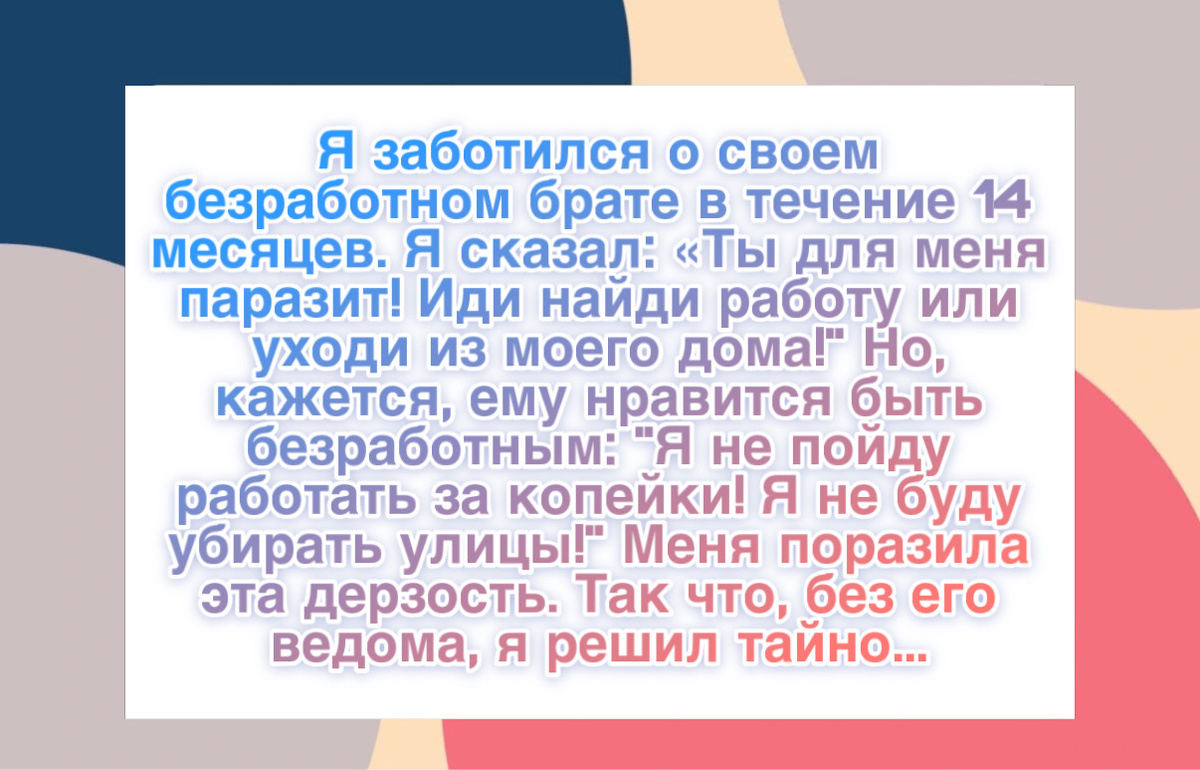 “Четырнадцать месяцев я содержал своего безработного брата. Платил за его квартиру, покупал продукты, пока он просто лежал на диване. В какой-то момент я сорвался и сказал ему: «Ты для меня паразит! Найди работу или уходи!» Он только рассмеялся и ответил: «Для меня нет нормальной работы! Я не буду мести улицы, как наша мама».