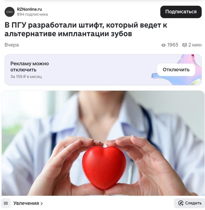 В новости указывается что "эффективность метода подтверждена компьютерным моделированием", "уже получен патент", но нет ничего о клинических испытаниях и долгосрочных наблюдениях. Особо отмечено, что этот метод "востребован среди пациентов с сахарным диабетом и недостатком альвеолярной кости, которым противопоказана имплантация". Далее Минобрнауки РФ говорит, что данный метод продляет срок службы зуба до 10 лет и делает лечение в два раза быстрее и дешевле. Впрочем, почитай об этом сам>>