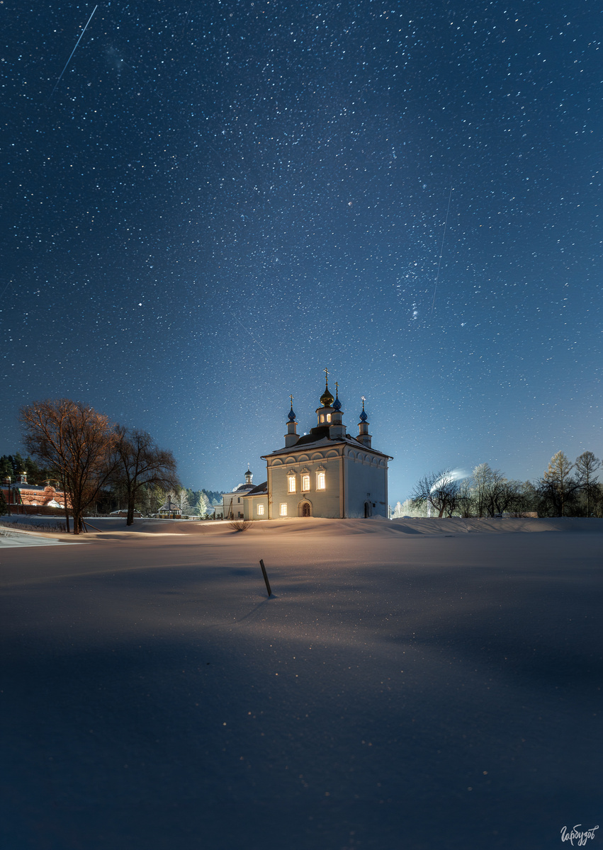 Свято-Введенский Макарьевский Жабынский мужской монастырь тонет в снегах. Сильнейший мороз. Звездная ночь. Тишина такая, что скрип снега под ногами кажется оглушительным. А потому стоишь как прибитый – делаешь вид, что здесь тебя нету… Горящие окна объемного Введенского храма разрисовывают нетронутый наст причудливыми тенями от каждого дерева, каждой былинки. Этот электрический, рукотворный свет среди белой холодной пустыни дает человеку понять его место в мирозданье. Оно на задворках, если честно… Воздух в такой мороз достигает предела прозрачности. И разноцветные звезды словно приблизились к обители и к грешнику, смотрящему в небо. Звезд мириады. Они были и будут. А ты как искорка на январском снегу: ракурс сменился, и она погасла. Зато рядом замерцала другая… Стоя наедине с Вечностью, испытываешь трепет. А потом начинаешь замечать, что в небе не хаос – там есть свои структуры: созвездия, Млечный путь. И понимаешь, что у Введенской церкви — светящейся, устремленной ввысь куполами, ес