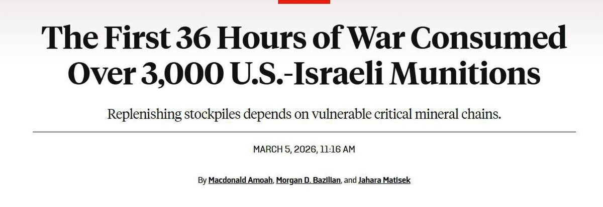 Об этом пишет Foreign Policy, анализируя стоимость уничтоженного американского оборудования. Радары AN/FPS-132 изготавливаются и поставляются в течении 5-8 лет при стоимости в 1.1 млрд. долларов, а AN/TPS-59 могут быть заменены в течении двух лет, и стоят 50-75 миллионов. При этом, производство компонентов для этих радаров зависит от галлия, 98% которого производится в Китае. Проблемой является еще и количество боеприпасов, расходуемых США и Израилем для ударов по Ирану. "За первые 36 часов американо-израильской кампании против Ирана было израсходовано более 3000 высокоточных боеприпасов и перехватчиков, что выявило критическую уязвимость в цепочке поставок", - пишет FP. 🤗 НАСОНОВ ▶️