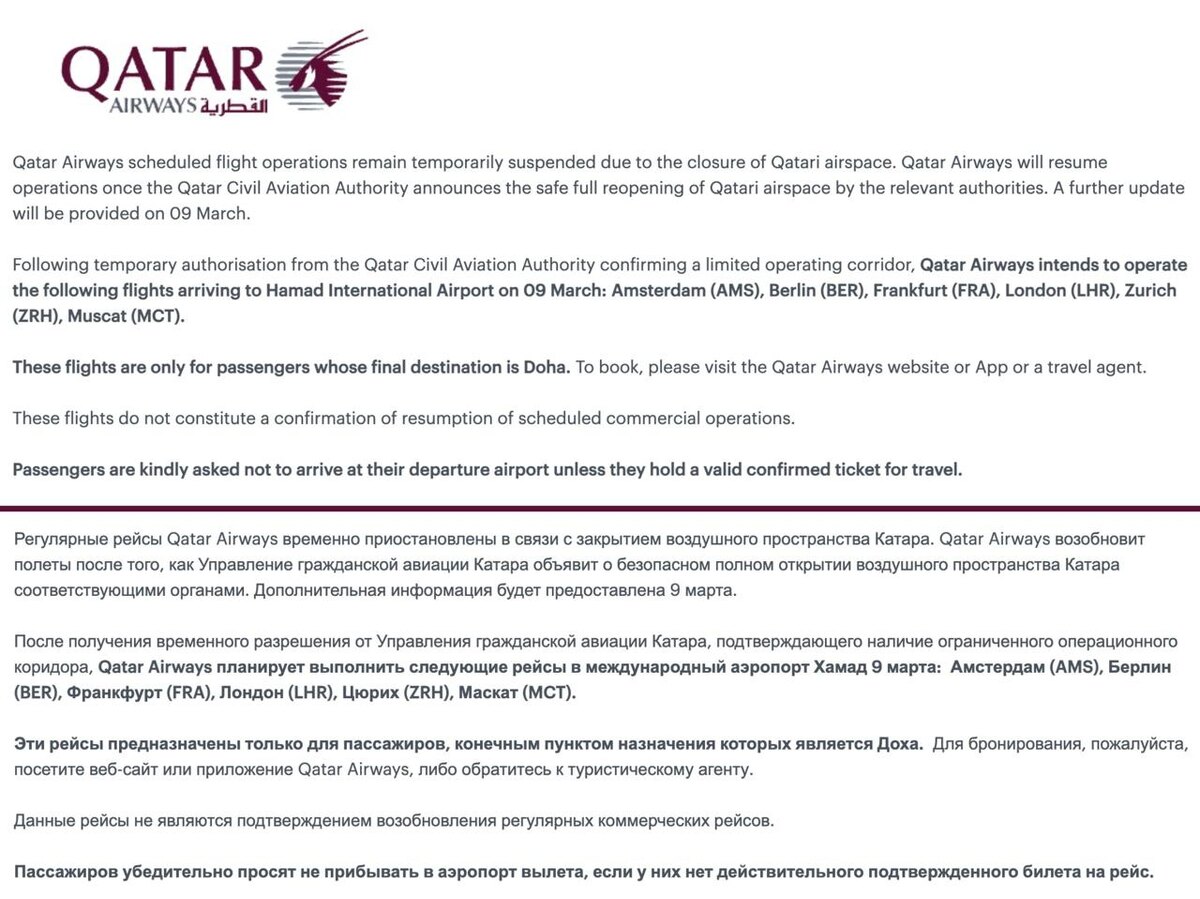 🇶🇦 Qatar Airways собирается завтра, 09 марта, выполнить специальный рейс из Дохи в Москву, сообщает Посольство РФ в Катаре