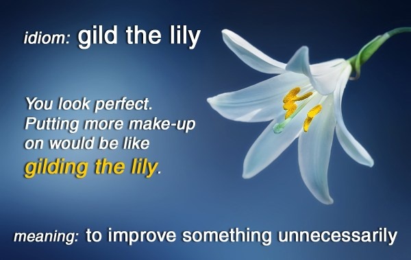Идиома to gild the lily описывает избыточные, ненужные действия — когда человек добавляет лишние детали, украшения или изменения туда, где они не требуются. Результат часто получается вычурным, неестественным или даже хуже исходного варианта.