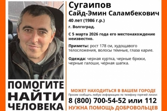 Мужчина пропал в четверг, 5 марта. Волонтеры волгоградского поискового отряда «ЛизаАлерт» разыскивают 40-летнего Сайд-Эмина Сугаипова. Он пропал без вести в четверг, 5 марта, и с тех пор его местонахождение остается неизвестным. В день исчезновения мужчина был одет в черную куртку, такого же цвета брюки и шапку, на ногах – черные галоши. Приметы пропавшего: рост 178 см, нормальное телосложение, темные волосы и карие глаза. Всех, кто располагает информацией о местонахождении Сайд-Эмина Сугаипова, просят связаться по телефонам 8 (800) 700-54-52 или 112. Елена Стеценко. Фото: поисковый отряд «ЛизаАлерт».