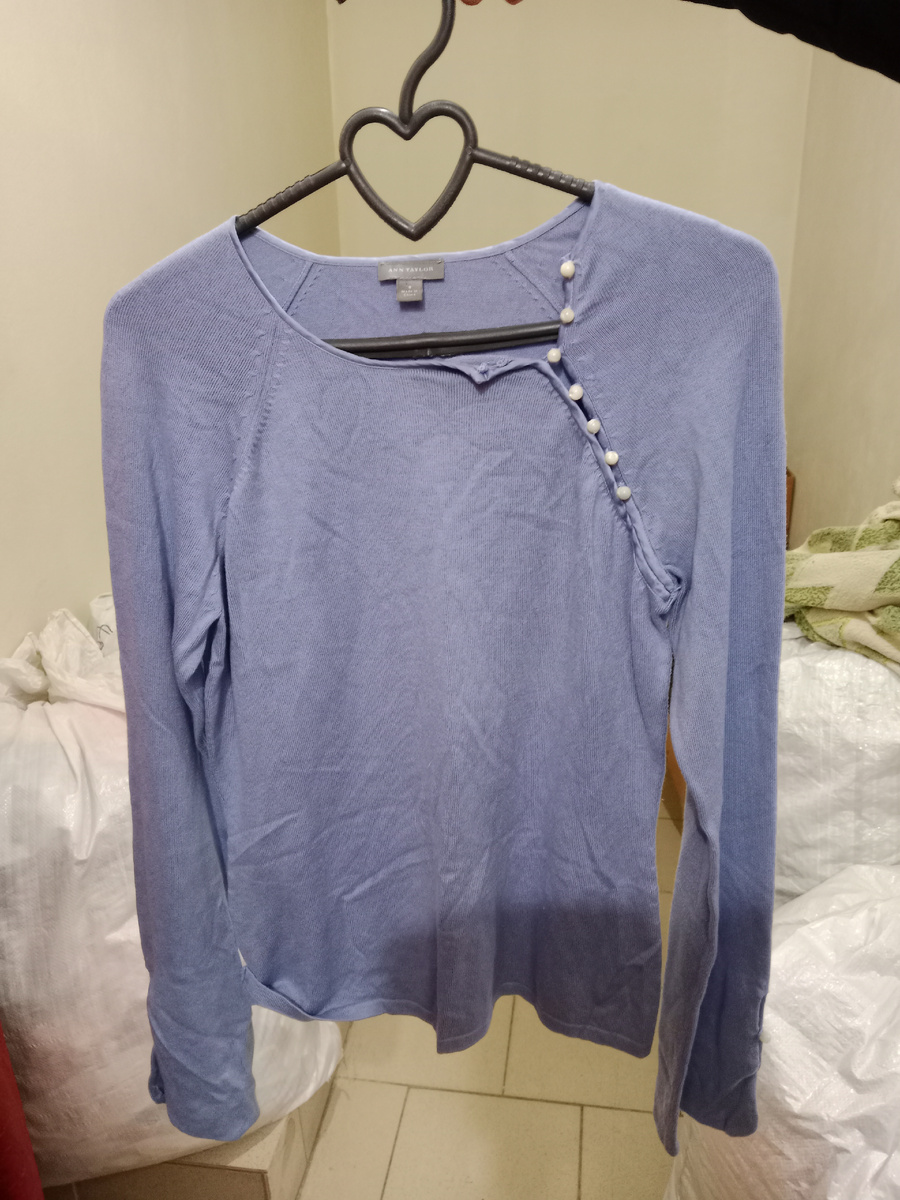 Очень любую фиолетовый, стреневый, лиловый цвет. Джемпер чистого красивого сиреневого цвета. Фасон показался чересчур "правильным" , спокойным и скучноватым. Только разрезики на рукавах слегка разбавляли скромный силуэт. Белые пуговицы бусинки на асимметричном вырезе. Наверное , такой стиль можно назвать "строгим".