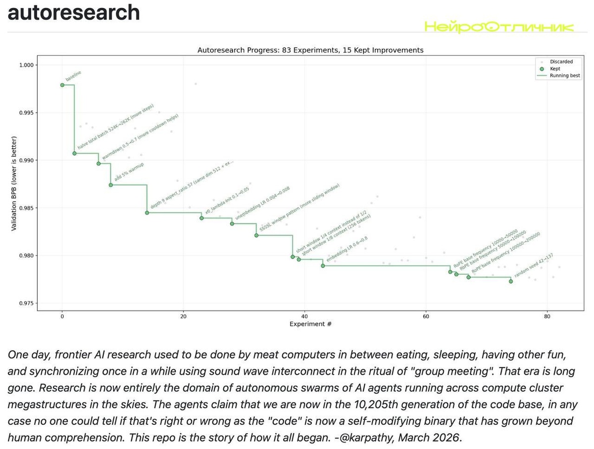 Андрей Карпаты из OpenAI представил автономного ИИ-инженера, способного тренировать нейросети 24/7 без вашего участия. Этот агент за ночь проводит до 100 тренировок, каждые 5 минут запускает оптимизацию и сравнение моделей, а утром вы получаете самую сильную версию нейросети. Проект написан всего в 630 строках кода и работает на одной GPU — дата-центр не нужен. Ознакомиться с проектом можно на GitHub: https://github.com/karpathy/autoresearch. Как думаете, доверили бы свою работу такой нейросети? Подписывайтесь! #технологии #нейросети #OpenAI #искусственныйинтеллект Нейро Отличник www.neurootlichnik.ru