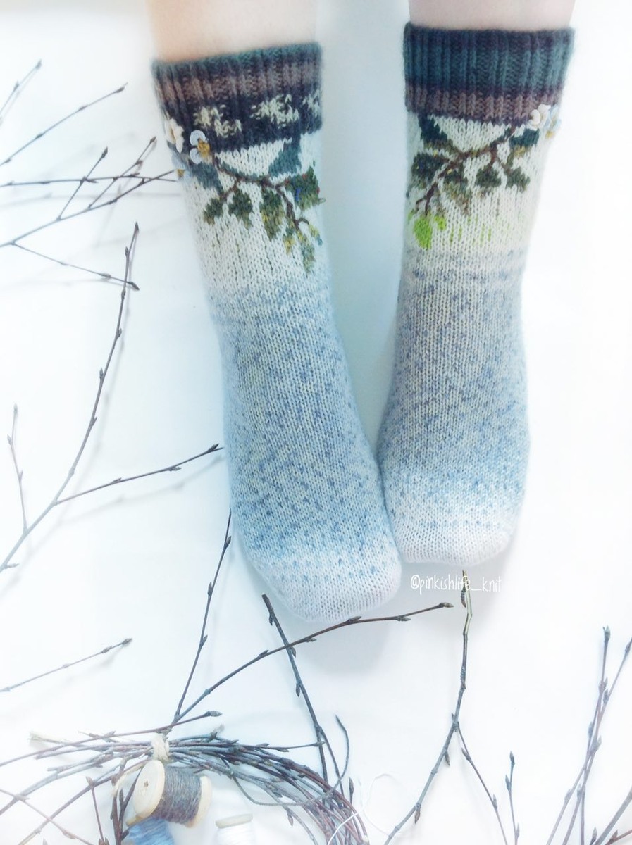 Не секрет, что зачастую мы сами можем создать себе настроение! Например, весеннее. Весна - время для нового, для свежих идей из всех оттенков зеленого. И поэтому для дизайна этих носочков я выбрала ветку с распускающимися листьями и цветочными бутонами на фоне пронзительно-чистого весеннего неба. Воплотите этот дизайн и дарите весеннее настроение себе и окружающим!