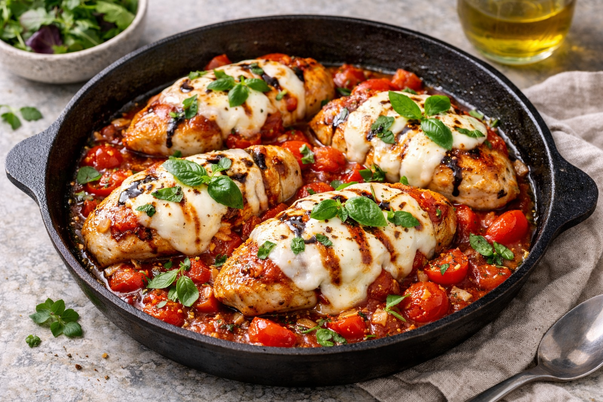 🍗🌿 Лёгкая курица капрезе на сковороде: «Горячий, сытный и очень быстрый обед на одной сковороде»