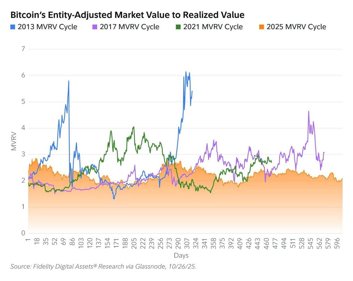 Инвесторы, интересная мысль появилась в новом исследовании Fidelity Digital Assets. Они утверждают, что классическая модель «бум-крах» в Биткоине может уходить в прошлое. И аргументы довольно сильные. На пике в октябре 2025 года капитализация BTC достигла примерно $2.5 трлн. Но при этом в январе 2026 произошло необычное событие — годовая реализованная волатильность обновила 17 исторических минимумов. Это никогда не происходило так рано после нового исторического максимума. Другими словами: цена всё ещё близко к вершинам, а рынок ведёт себя спокойнее, чем когда-либо раньше. Что изменилось? Главное — структура спроса. Сегодня почти 12% всего предложения BTC держат публичные компании и ETF. Причём большая часть этих покупок произошла после 2023 года. Факты: — 49 публичных компаний держат более 1000 BTC каждая — крупнейший Bitcoin ETF достиг $75 млрд AUM менее чем за 2 года — для сравнения: золотому ETF GLD понадобилось почти 7 лет, чтобы достичь такого же масштаба Это говорит о