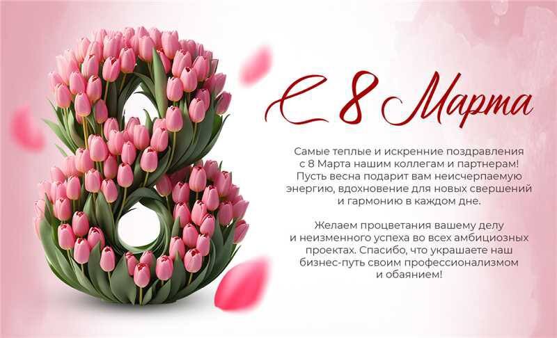 ! Этот весенний праздник — ещё один повод сказать вам слова искренней благодарности и восхищения! Вы вдохновляете, наполняете жизнь теплом и гармонией, создаёте атмосферу заботы, в которой становится возможным многое. Спасибо за ваше доверие и за то, что вы с нами. Для нас это большая ценность и важная часть того пути, который мы проходим вместе. Пусть эта весна принесёт вам больше радостных моментов, внимания, улыбок и приятных событий. Поздравляем с праздником! 💐