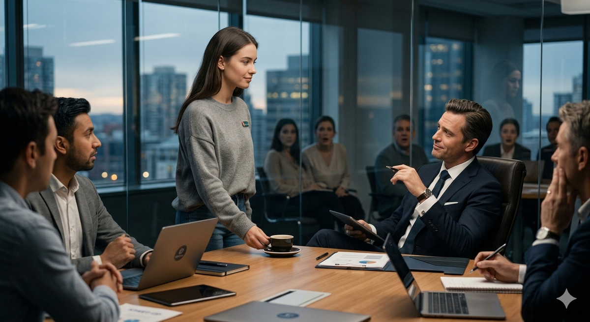 Девушка не ушла. Она обошла длинный дубовый стол, подошла к центральному креслу — месту председателя, на которое обычно садились руководители, — и спокойно в него опустилась. Открыла свой ноутбук. Вывела первый слайд презентации на экран.