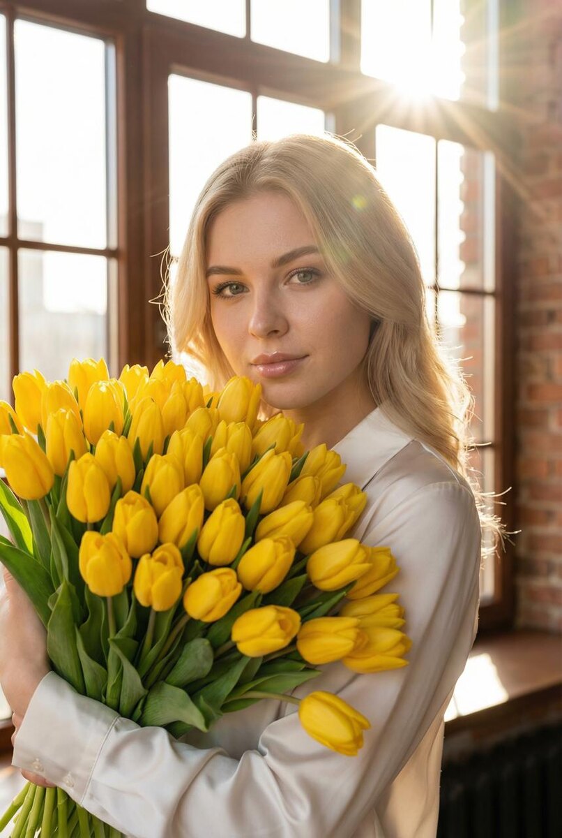 Сгенерировать фото⚡️ Используй загруженное фото как face reference. Строгое сохранение лица 1:1 — черты, пропорции, форма лица, нос, губы, скулы, подбородок, брови, посадка и цвет глаз, линия роста волос, возраст и телосложение, цвет кожи без изменений и «улучшений». Близкий кадр, голова и цветы. Натуральная текстура кожи с видимыми порами, реалистичные глаза с живыми бликами, без «стеклянного» эффекта. Без очков. Реализм. Близкий кадр по плечи, солнечный свет бьет из окна как в лофте коричневые, со створками, падает на персонажа, на стену, на цветы. Создай близкий портрет, персонаж одета в белую шелковую рубашку, легкий макияж. Персонаж смотрит в кадр. На фоне на подоконнике не стоит ничего. В руках около лица держит букет из реалистичных желтых тюльпанов 1000 шт. Освещение — яркое, солнечное, с лучами, бликами на волосах и губах; Высококачественный, реалистичный макропортрет.