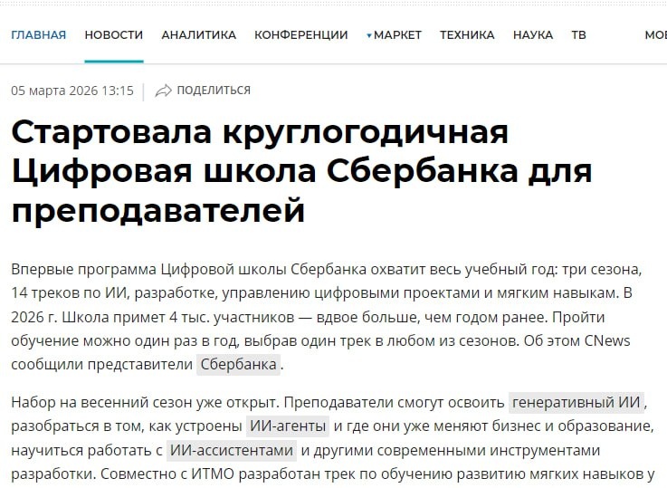 Помните, я писала что государство рано или поздно включится в ИИ-игру и навыки нейросетей станут базой, а не конкурентным преимуществом? Вот оно. Сбербанк запустил круглогодичную Цифровую школу для преподавателей. В 2026 году обучат 4000 человек - вдвое больше чем в прошлом году. ❗Фишка в том что преподаватели - это мультипликатор. Один обученный преподаватель несет это в класс к тридцати людям. Через пару лет школьники и студенты будут приходить на рынок труда с базовым пониманием ИИ, как само собой разумеющимся. 👉Окно когда "умею работать с нейросетями" звучит как уникальный навык - закрывается. Те кто разберется сейчас глубже среднего - останутся впереди. Остальные будут догонять. Вы чувствуете как меняется рынок - или пока кажется что это где-то далеко? Подписывайтесь на мой канал в Max