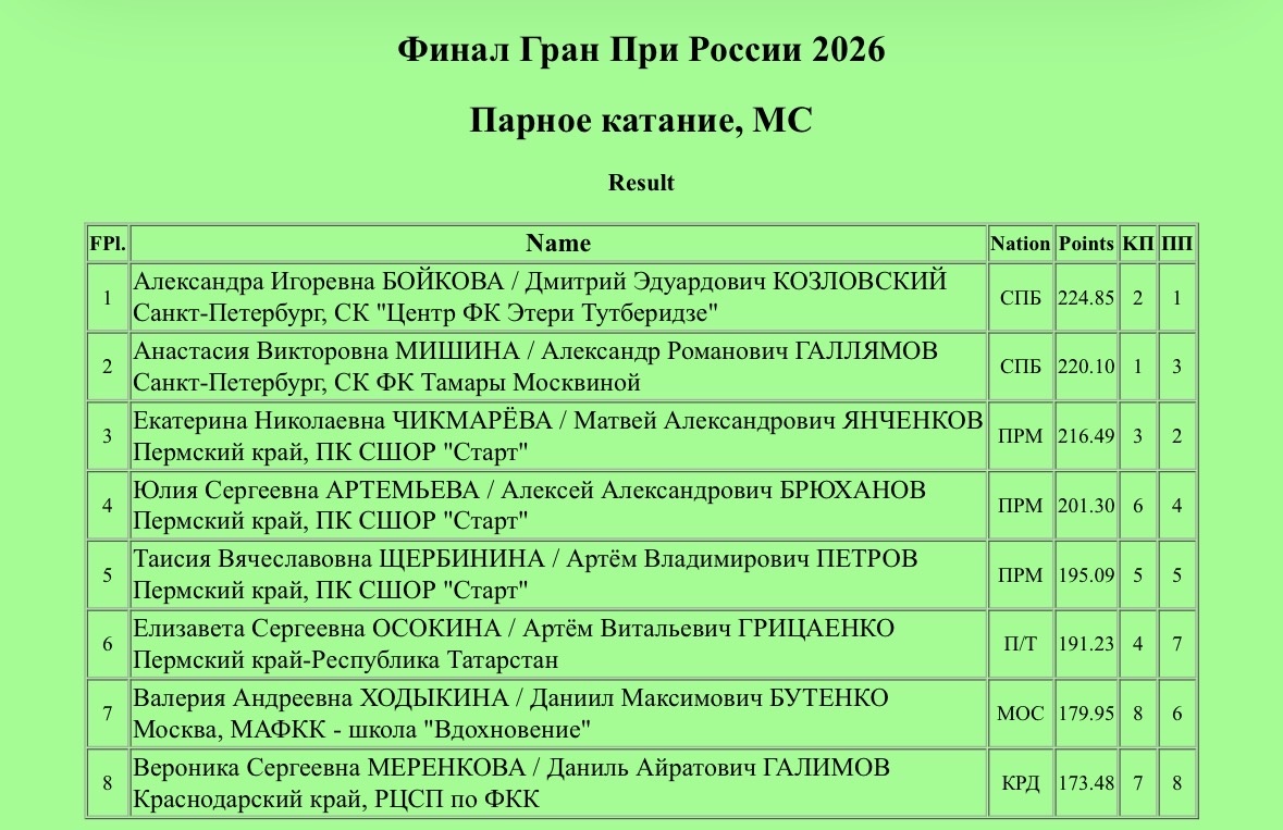 В сезоне 2025–2026 спортивная пара Александра Бойкова - Дмитрий Козловский выиграла все главные соревнования. В их копилке — две победы на этапах Гран-при России, золото чемпионата страны и победа в финале Гран-при России.