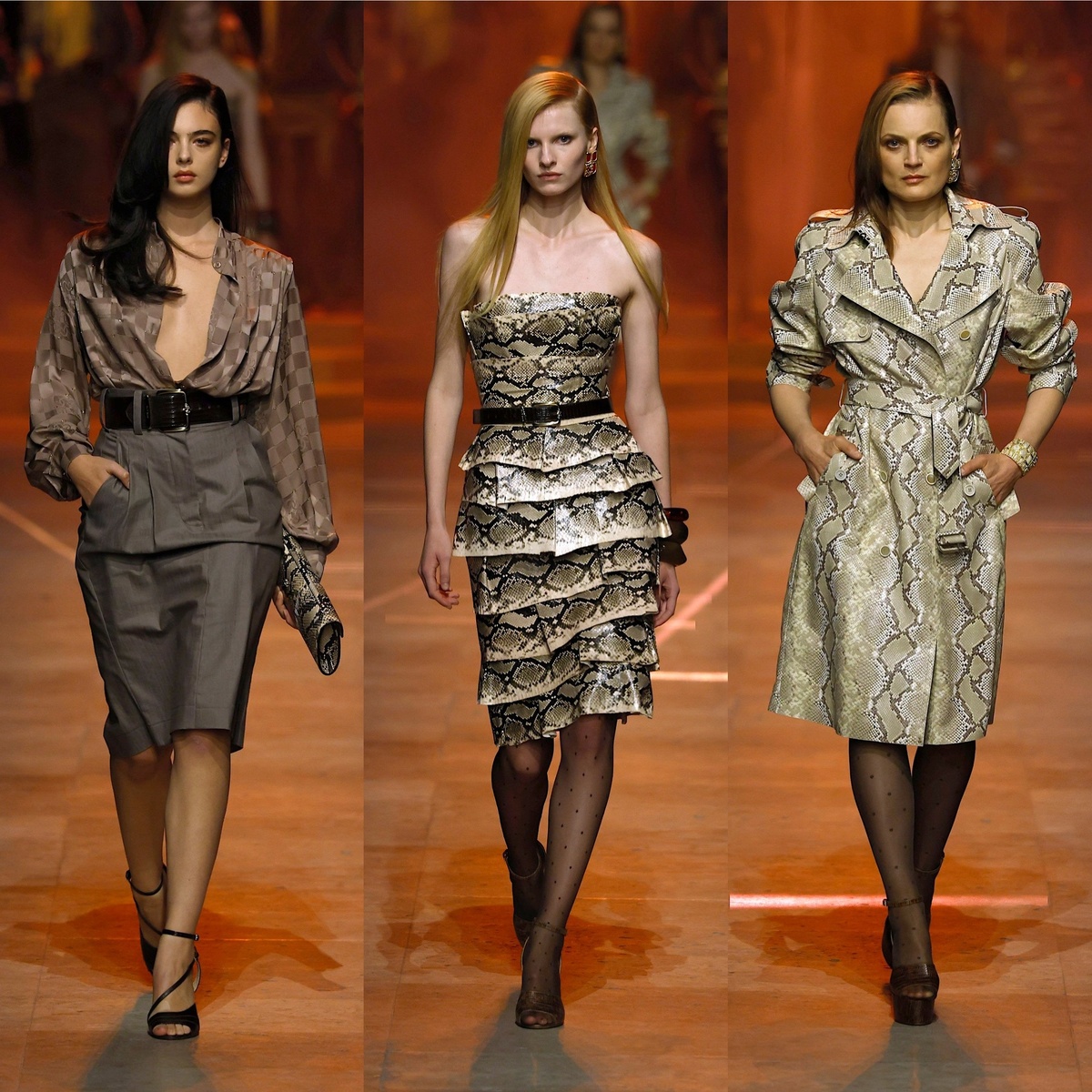Питон выступает в роли негромкого лейтмотива — узора, легко меняющего настроение. Он придаёт силу структурированному тренчу, скользит в чувственность шифонового платья и затихает до шёпота в изящном изгибе серьги. Правила растворяются, но равновесие сохраняется: воздушная блуза находит пару в юбке‑карандаше, а сандалии уверенно шагают рядом с безупречным деловым костюмом.