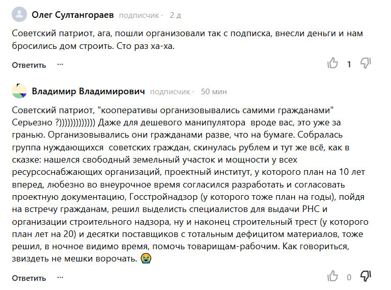 А вы заметили крайне агрессивную реакцию антисоветчиков на мои упоминания о такой возможности решения жилищного вопроса в СССР, как жилищно-строительные кооперативы(ЖСК)? Реакцию, доходящую до полной неадекватности и отрицания фактов? Например, такая: Попытка предоставить им ссылку на постановление Совета министров СССР и Устав жилищно-строительного кооператива, чтобы вернуть ситуацию на твердую почву фактов к положительному результату не привела и, видимо, не приведет в силу полной неспособности рассуждать трезво и адекватно. По этой причине немного рассуждений для тех, кто хочет знать, как всё было на самом деле с возможностью решения жилищного вопроса с помощью ЖСК. Для начала база. ЖСК -- это такая же форма законной самоорганизации советских граждан, как дачно-строительные или гаражные кооперативы, только созданный для улучшения жилищных условий. Кто мог стать членом ЖСК? Любой гражданин, достигший возраста 18 лет, постоянно проживающие в данном населенном пункте и нуждающи
