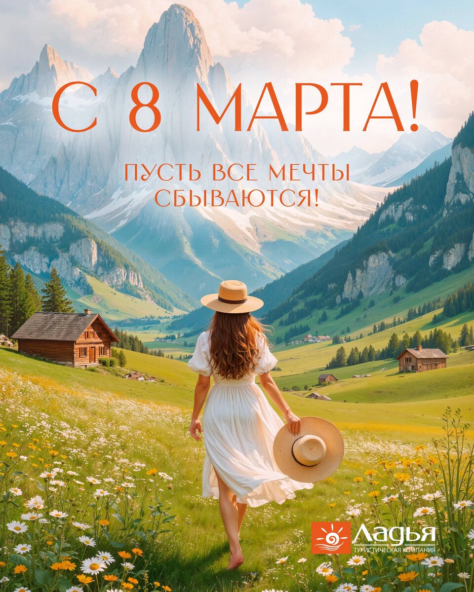 ! Коллектив туристической компании «ЛАДЬЯ» поздравляет вас с Международным женским днём и праздником весны! 🌞 Пусть яркое солнце освещает ваши пути! Желаем вам энергии для всех задуманных планов и времени, чтобы наслаждаться жизнью! С 8 марта! 💐
