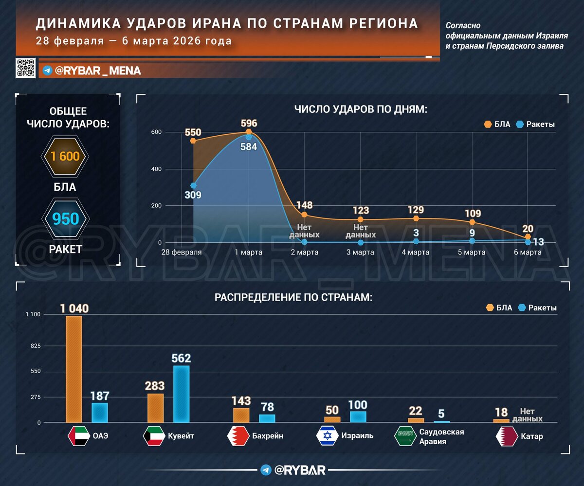 Хотя кадров прилетов по объектам в странах Персидского залива ощутимо меньше пока не становится, из уст официальных лиц США в последние дни можно было не раз услышать фразы о том, что у Ирана заканчиваются ракеты. 🔸Раз открытых данных о размере арсеналов нет, остаются лишь косвенные — динамика пусков БЛА и ракет с начала войны. За отправную точку возьмем официальную статистику стран, по которым стреляют: занижать эти цифры им нет смысла, так что можно считать их верхней границей. 🔸Если опираться на эти числа, то можно действительно заметить заметное проседание в количестве ракетных ударов начиная с 1 марта. В то же время интенсивность атак дронами не менялась в течение нескольких дней, но резко снизилась к 6 марта. 🖍О чем это может говорить? С одной стороны, теоретически иранцы, конечно, могут копить боеприпасы для какой-нибудь крупной атаки. Но с большей вероятностью на динамике сказалось то, что запасы ракет у персов были совсем не бесконечные, особенно после войны 2025 года. 🚩Та
