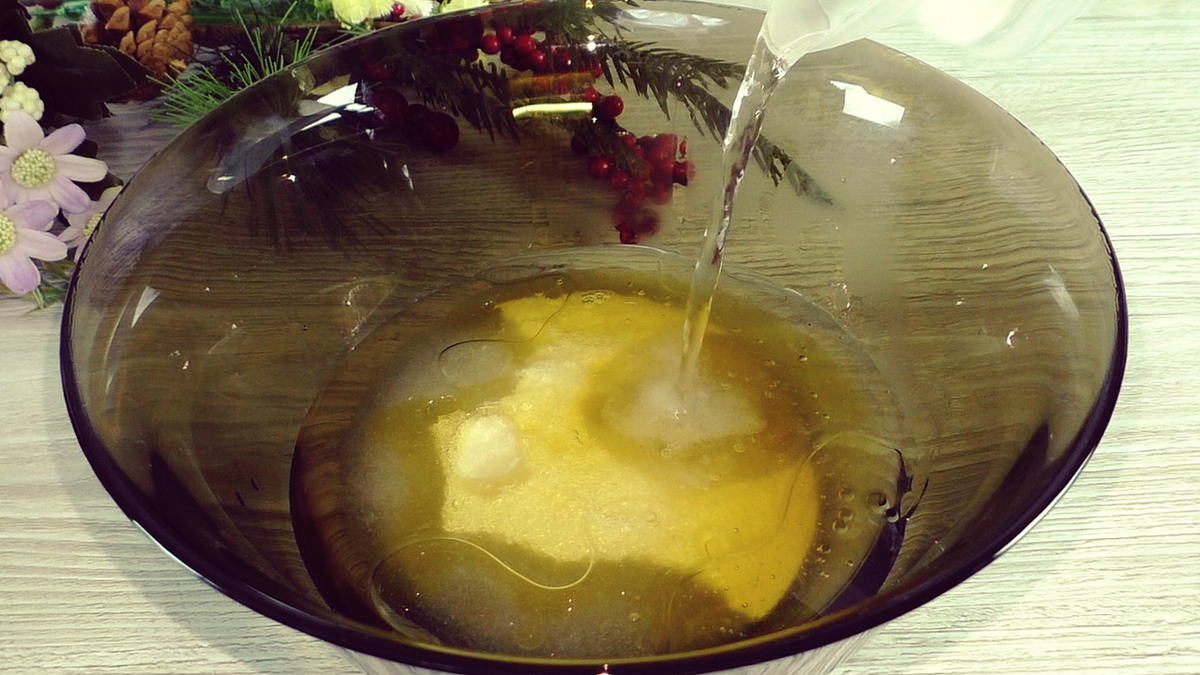 Теперь добавляем горячую воду, хорошо перемешиваем до полного растворения сахара и соединения всех ингредиентов.