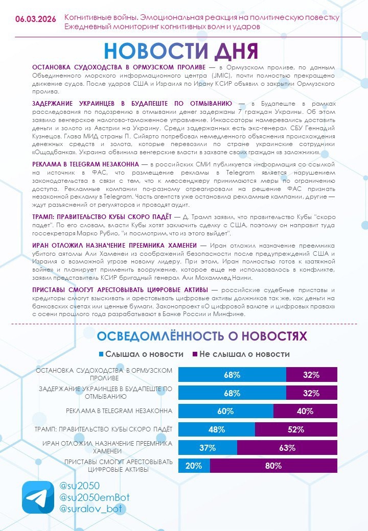06.03.2026 🔹 Большинство опрошенных (67%) находятся в спокойном состоянии. Усталость отметили 17%, бодрость — 8%, а нервозность остается на минимальном уровне (4%). 🔹 Осведомленность о новостях этого дня заметно выше среднего уровня. Наиболее известными (68% респондентов слышали) оказались сразу две новости: о почти полной остановке судоходства в Ормузском проливе, а также о том, что в рамках расследования по подозрению в отмывании денег в Будапеште задержаны 7 граждан Украины на инкассаторском автомобиле. Наименее известным (только 20% были осведомлены) стало сообщение о том, что ЦБ и Минфин подготовили законопроект, который позволит судебным приставам и кредиторам взыскивать и арестовывать цифровые активы должников наравне с деньгами на банковских счетах и ценными бумагами. 🔹 Ярко выраженный негативный отклик вызвало сообщение о заявлении Трампа, что правительство Кубы "скоро падет". Только 40% читателей отнеслись к сообщению нейтрально и в основном «ждут развития событий». Ост