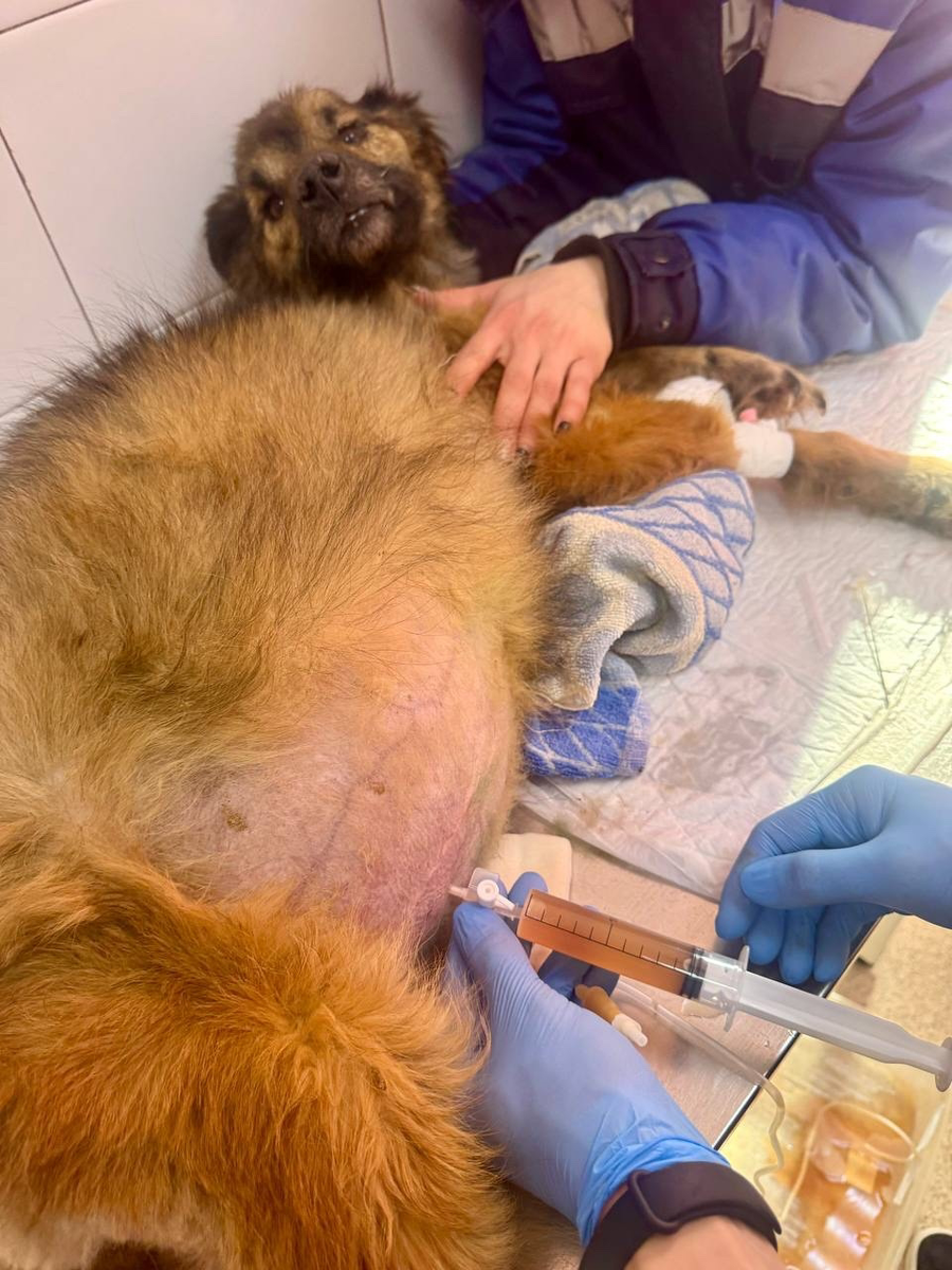 Она поступила к нам в критическом состоянии. Раздутый живот, огромный, как барабан. Она не могла встать на 4 лапы — просто лежала и смотрела на мир глазами, полными боли и вопроса: «Почему?»
