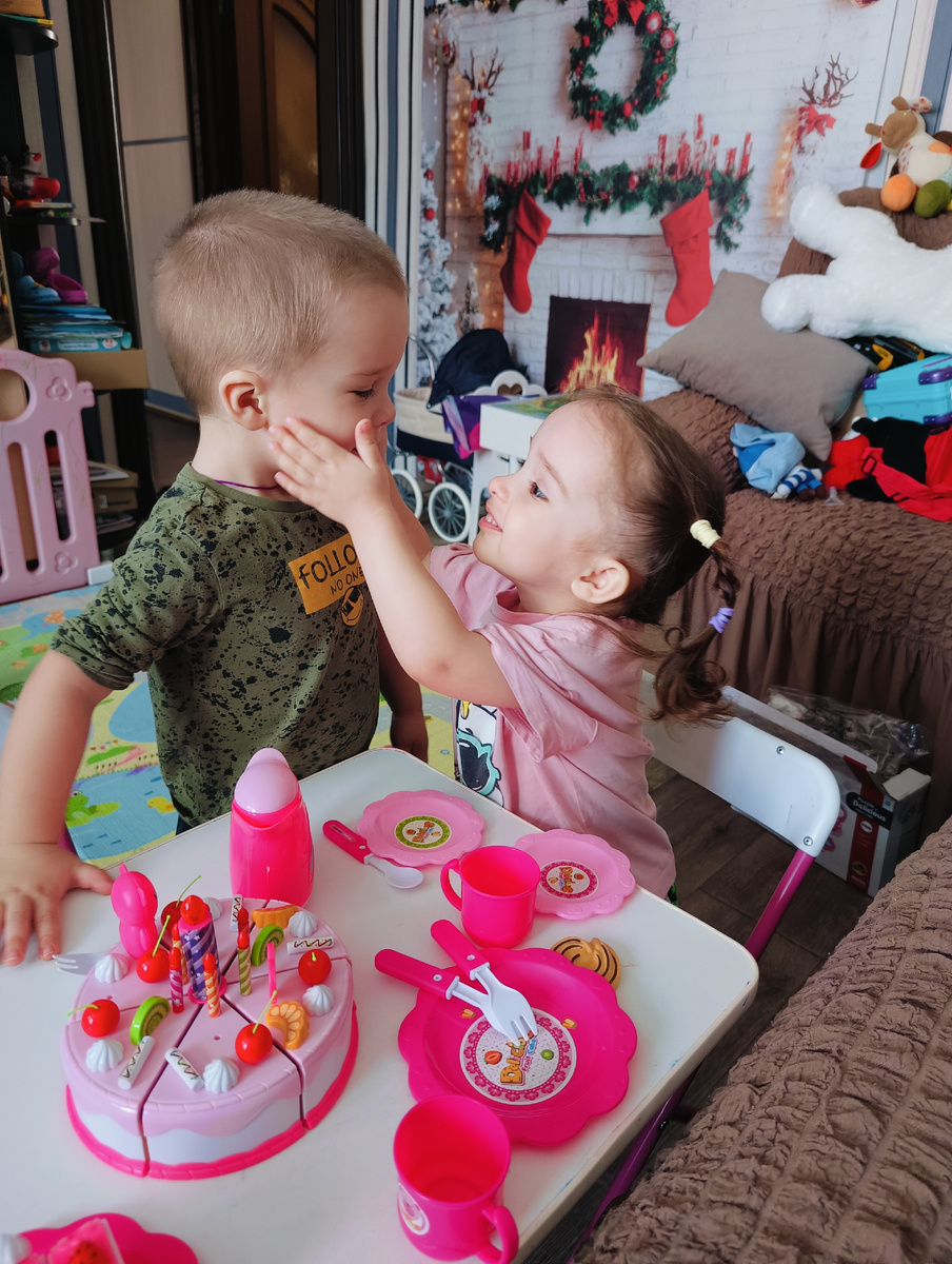 Вот день рождения-то как впечатлил. Завтрак у малышей оказался не праздничным, но кашку съели с удовольствием. И так как торт им не предложили, пошли они игрушечный торт доставать.