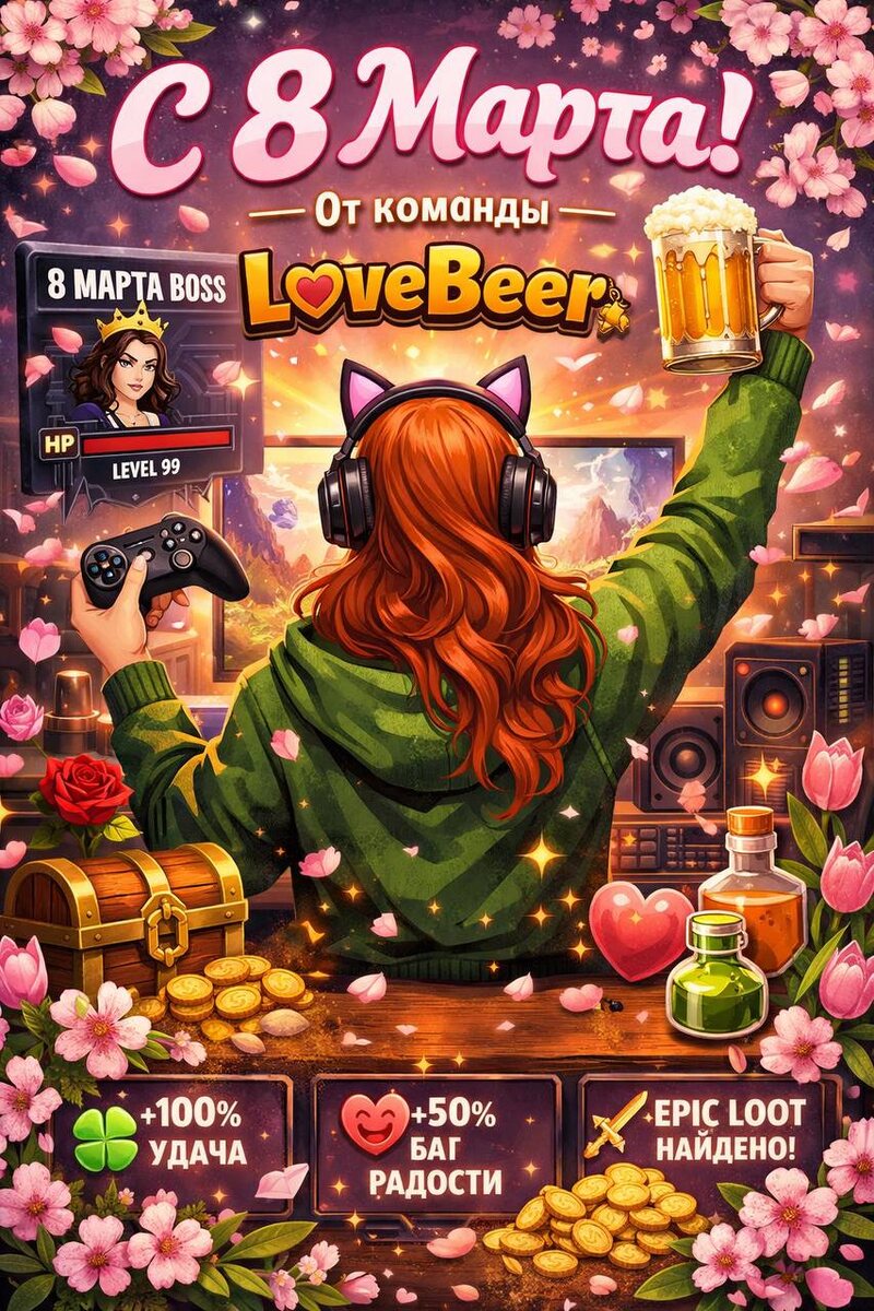 ! 🌸 Команда LoveBeer поздравляет всех девушек нашего сообщества с Международным женским днём! Пусть в вашей жизни будет побольше эпичных побед, редкого лута и сохранений перед сложными боссами. Пусть каждый день приносит новые уровни счастья, а все квесты — будь то в играх или в жизни — закрываются на 100% прохождения. Спасибо, что делаете наше сообщество ярче, теплее и интереснее. Оставайтесь такими же сильными, вдохновляющими и невероятными. С праздником! 💐
