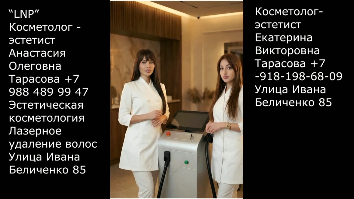 Салон красоты “LNP” Косметолог - эстетист Анастасия Олеговна Тарасова +7 988 489 99 47 Эстетическая косметология Лазерное удаление волос Улица Беличенко 85 Косметолог-эстетист Екатерина Викторовна Тарасова +7-918-198-68-09