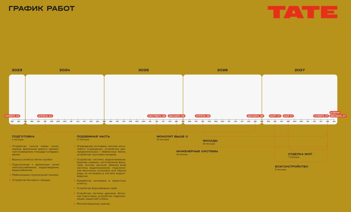 Судя по графику, на площадке ЖК «TATE» в апреле должны будут стартовать фасадные работы