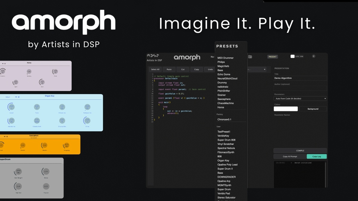 Компания Artists in DSP выпустила Amorph (open beta) — бесплатное приложение для macOS и Windows, позволяющее создавать аудиоплагины с помощью текстовых запросов. Формально это AI-driven инструмент, но по сути перед нами не генератор музыки, а генератор DSP-инструментов. И именно в этом его ключевое отличие. Amorph — это text-to-DSP плагин, работающий на базе языка Cmajor. Он превращает текстовую идею в рабочий инструмент или эффект. Причём это не один плагин, а два отдельных модуля: версия для инструментов и версия для FX. Если упростить максимально: вы описываете, какой эффект или инструмент вам нужен — и получаете рабочий плагин с интерфейсом и параметрами. Ask — вы обращаетесь к LLM (например, ChatGPT или Gemini) и просите сгенерировать код под вашу задачу.