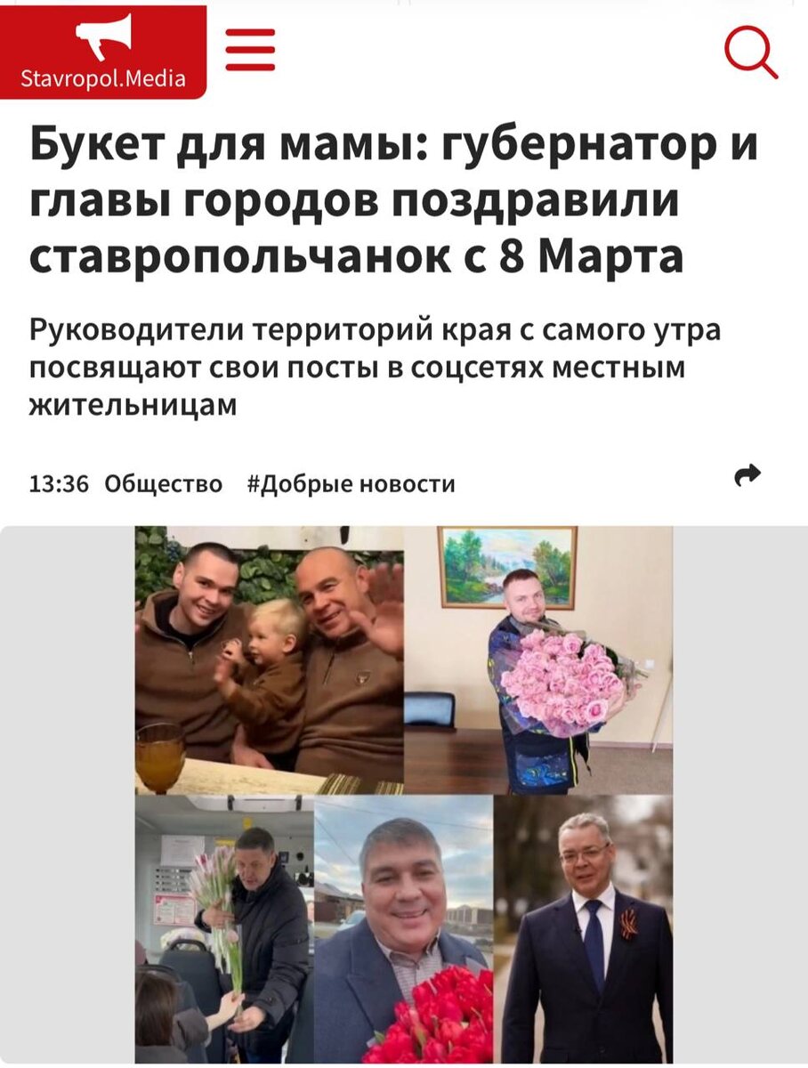 Stavropol.Media, 8 марта. С самого утра руководители территорий Ставрополья, министерств и ведомств публикуют в соцсетях посты, посвященные 8 Марта. Они благодарят женщин и осыпают их комплиментами. На их страницах также поздравления от бойцов СВО. Губернатор края Владимир Владимиров разместил трогательное видео, на котором представлены представительницы прекрасного пола разных профессий и возраста. Начинается поздравление с весенних цветов. Глава края отметил, что женщины наполняют жизнь теплом и добротой, вдохновляют на новые свершения и подвиги, поддерживают в трудную минуту. Глава Кировского округа Николай Новопашин разместил трогательное поздравление от юных жителей территории, десантников и Движения Первых. Ранее накануне праздника он порадовал пассажирок общественного транспорта и вручил представительницам прекрасного пола тюльпаны. С цветами он побывал также на ярмарке и порадовал женщин, которые стояли у прилавков. Поздравил также жён и матерей участников специальной вое