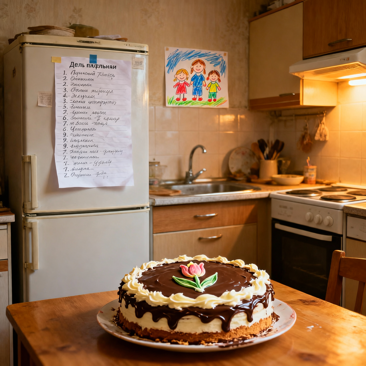Стол был накрыт. Криво. Тарелки стояли не ровно, вилки лежали с неправильной стороны, салфетки торчали из стаканов, как из дорогих ресторанов – видимо, Костя нашёл видео в интернете. В центре стола – торт. Кривой, осевший, с подтёками шоколадной глазури, но с надписью кремом: «МАМА». Буква «А» поехала вбок.