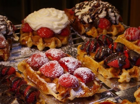 2. Подача. Брюссельские вафли хороши с клубникой, бананом и взбитыми сливками. Льежские самодостаточны, но с растопленным бельгийским шоколадом или кусочком мороженого — это песня!