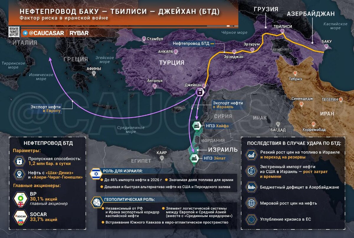 ?📝 Похоже, Тегеран не прочь испортить жизнь израильтям, ударив по нефтепроводу Баку-Тбилиси-Джейхан (БТД). Этот маршрут обеспечивает 30-46% израильского импорта нефти, и его остановка станет серьезным ударом по энергетической безопасности и снабжению армии. Придётся переходить на резервы и экстренные поставки из США – более дорогие и долгие. 💸 Но главные потери понесёт Азербайджан: до 80% нефти экспортируется через этот маршрут! Госбюджет трещит по швам. Пострадает и Турция как транзитный игрок, и потребители в ЕС. 🚩 Иран подозрительно относится к антииранской деятельности в Азербайджане, которую ведут представители Израиля и США. Удар по нефтепроводу уже навис дамокловым мечом над регионом. Не забываем и про недавний инцидент с аэропортом в Нахичевани – конфликт разгорается!💥 Всё это подрывает геополитические планы Запада по связке ЕС – Закавказье – Средняя Азия – Китай, задуманные в обход России и Ирана. 🇷🇺 Западные кукловоды явно торопят события, создавая хаос и нестабиль