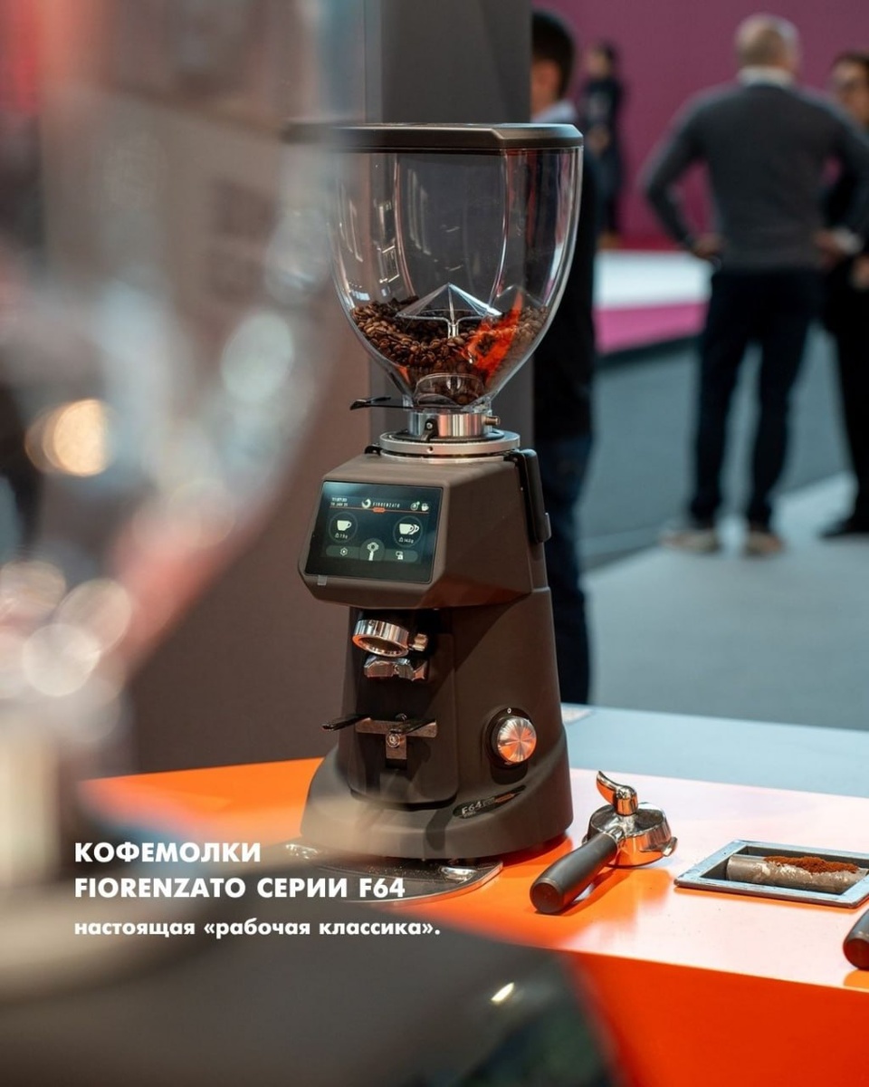 ». И одна из таких серий — кофемолки Fiorenzato F64. Эти кофемолки стоят в тысячах кофеен: от небольших specialty-баров до ресторанов и сетевых проектов. Причина проста — серия F64 оказалась очень точным балансом между производительностью, стабильностью помола и ценой. В основе всех моделей линейки — плоские жернова Ø64 мм, которые считаются универсальным стандартом для профессиональных эспрессо-кофемолок среднего класса. Они обеспечивают стабильный помол, хорошую экстракцию и скорость работы, достаточную для кофеен со средним потоком гостей. Кроме того, кофемолки оснащены бесступенчатой микрометрической регулировкой помола, сенсорным управлением и бункером для зерна объемом около 1,5 кг, что делает их удобными для ежедневной работы в кофейне. Сегодня серия F64 включает сразу несколько моделей — от классических до высокотехнологичных. F64 E Базовая электронная кофемолка серии. Простая, надежная, понятная в работе. Отличное решение для небольших кофеен. F64 EVO Версия с системой