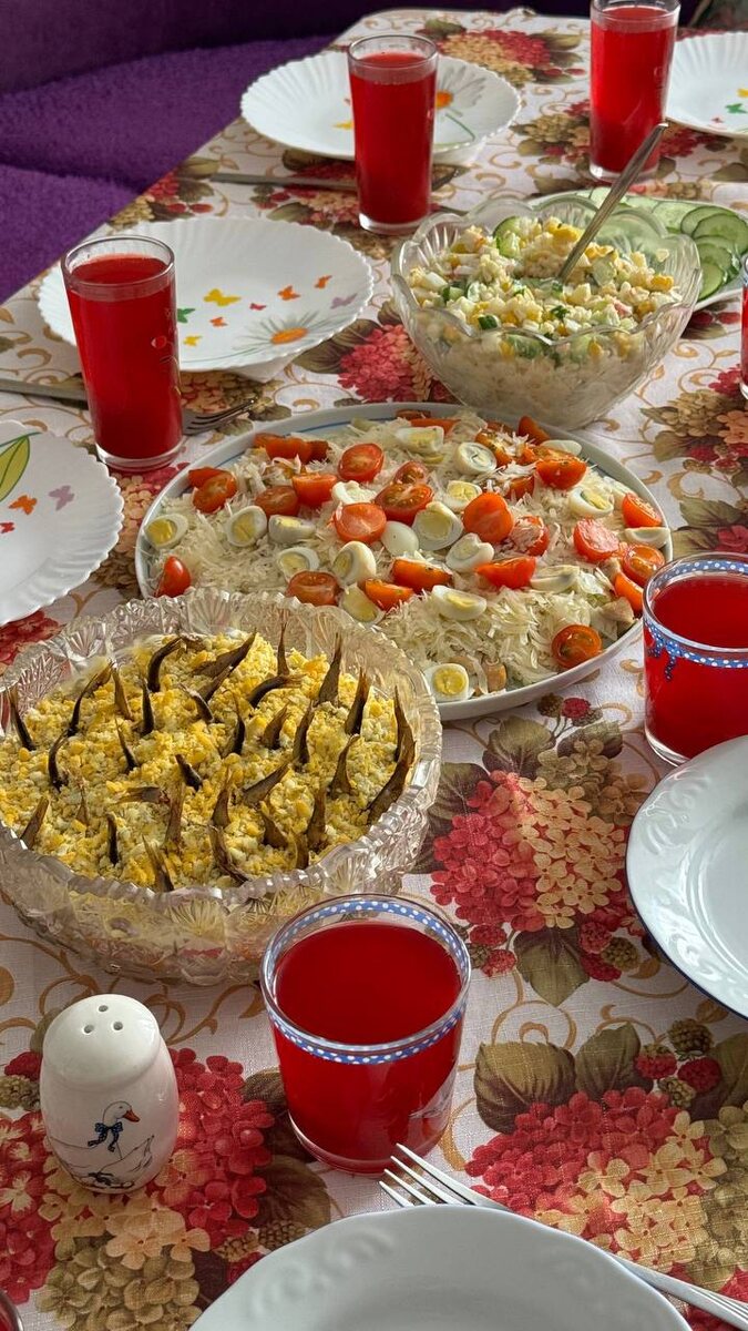 Пока Денис дарит тюльпаны, мы пришли на Праздничный обед к родителям.